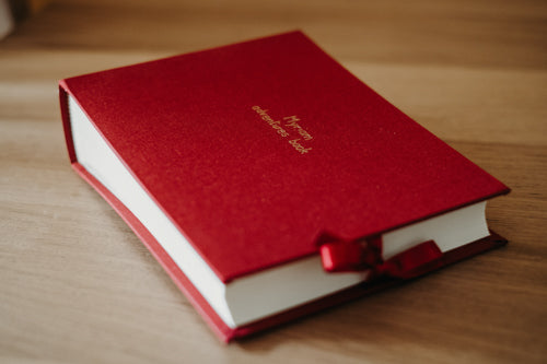 Album dimensioni 15x20 cm, in stoffa con nastrino di raso per la chiusura, pagine avorio.