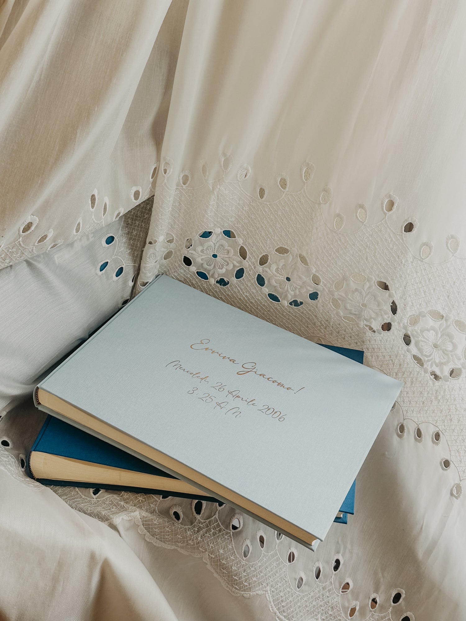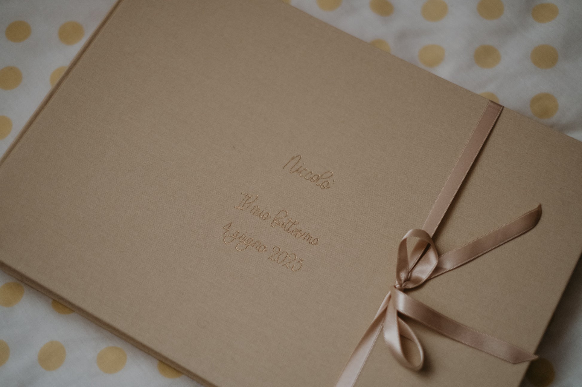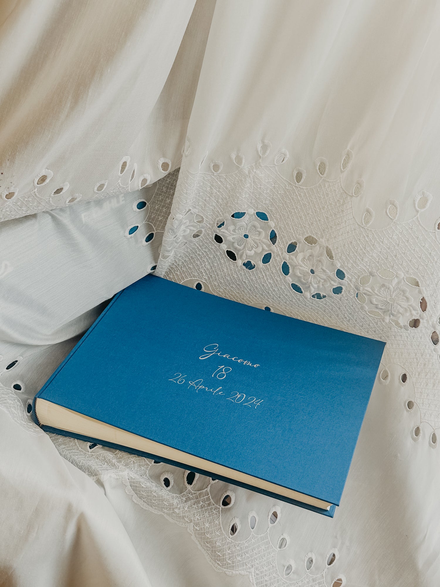 Album dimensioni 25x35 cm, in stoffa , pagine avorio, pergamino di protezione tra le pagine.