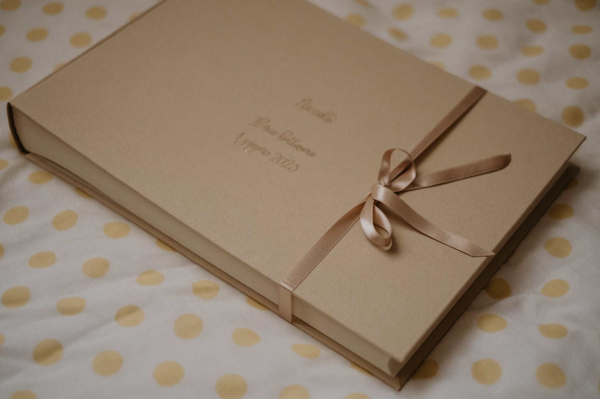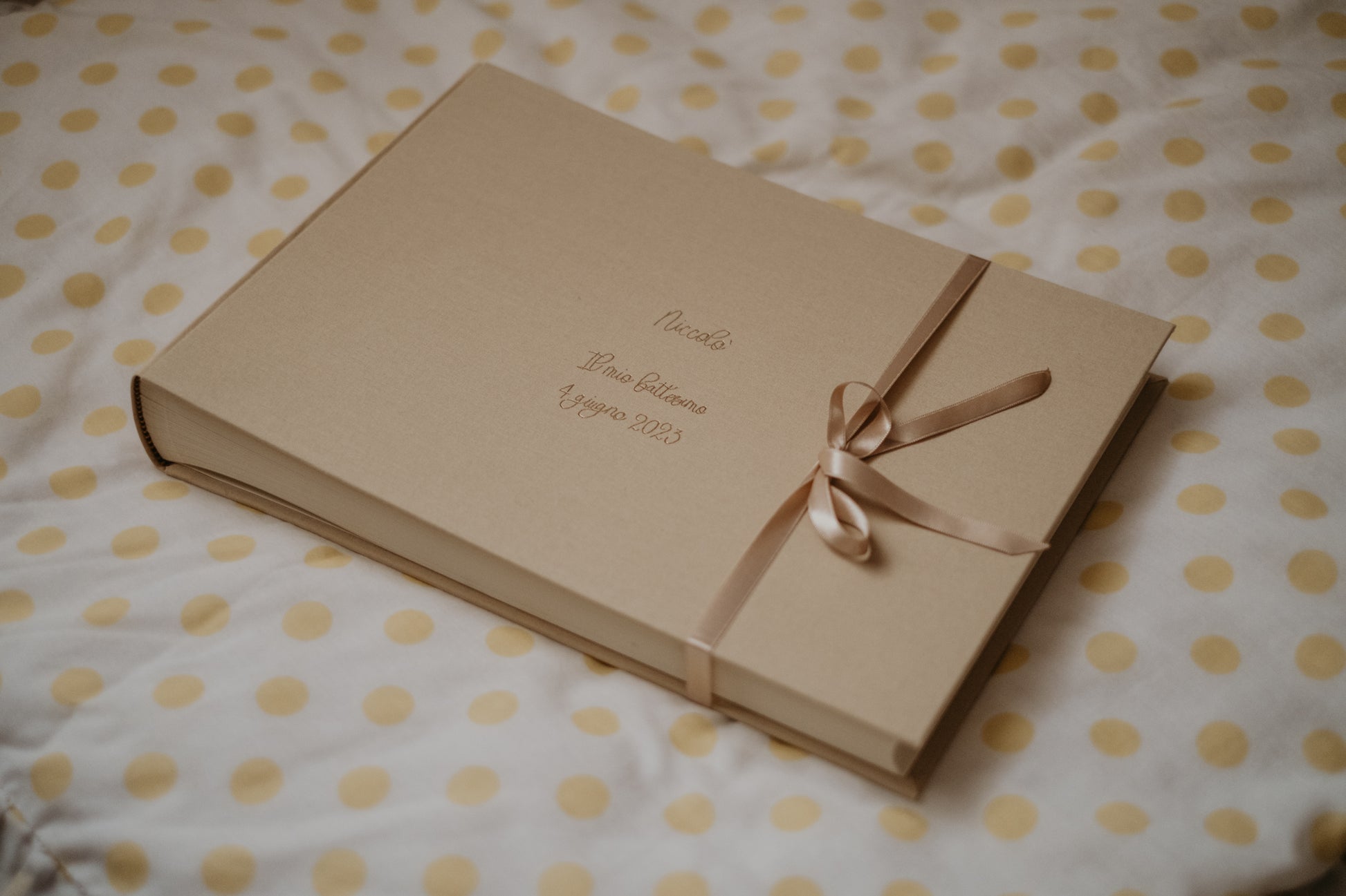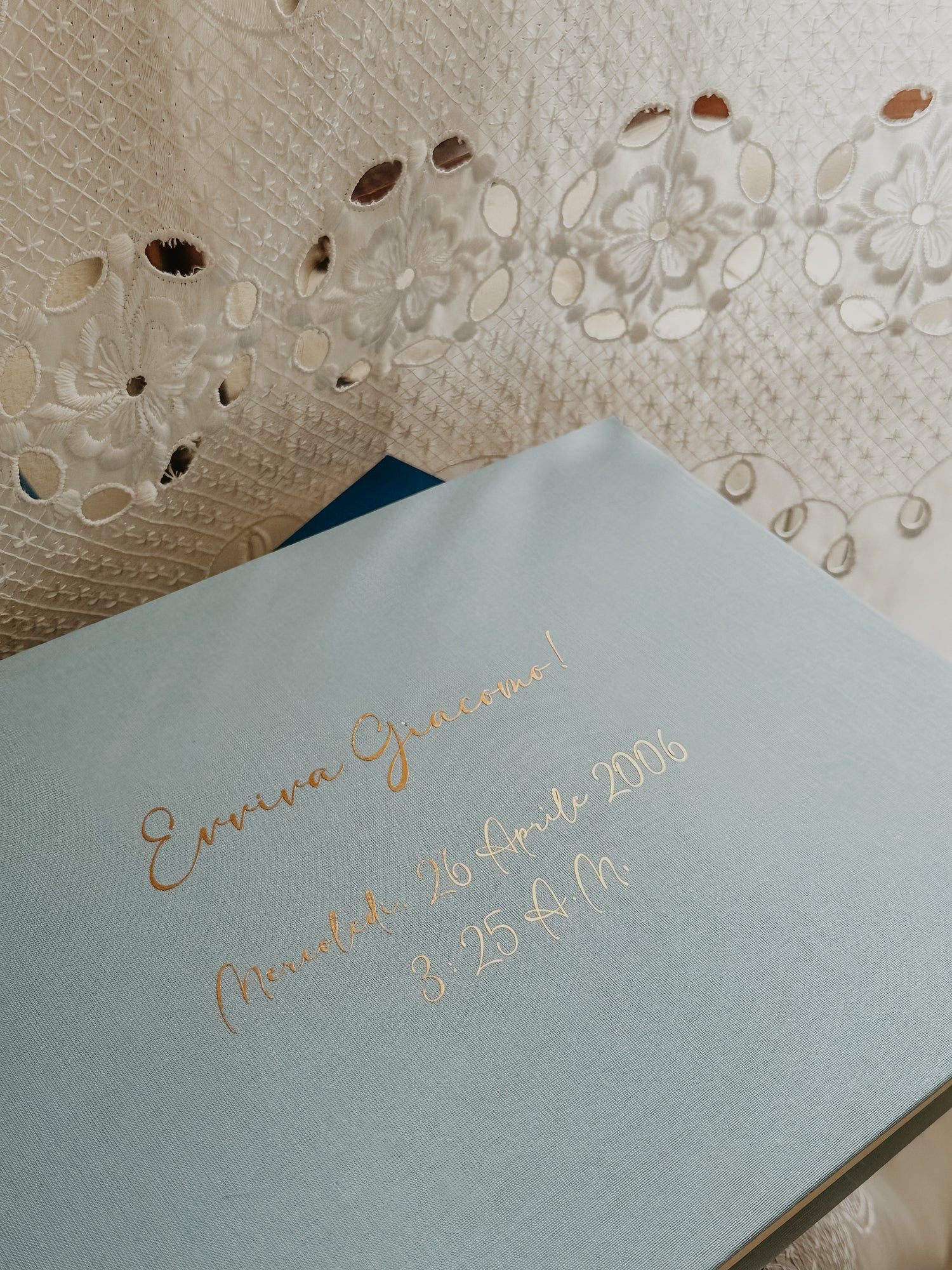 Album dimensioni 25x35 cm, in stoffa , pagine avorio, pergamino di protezione tra le pagine.