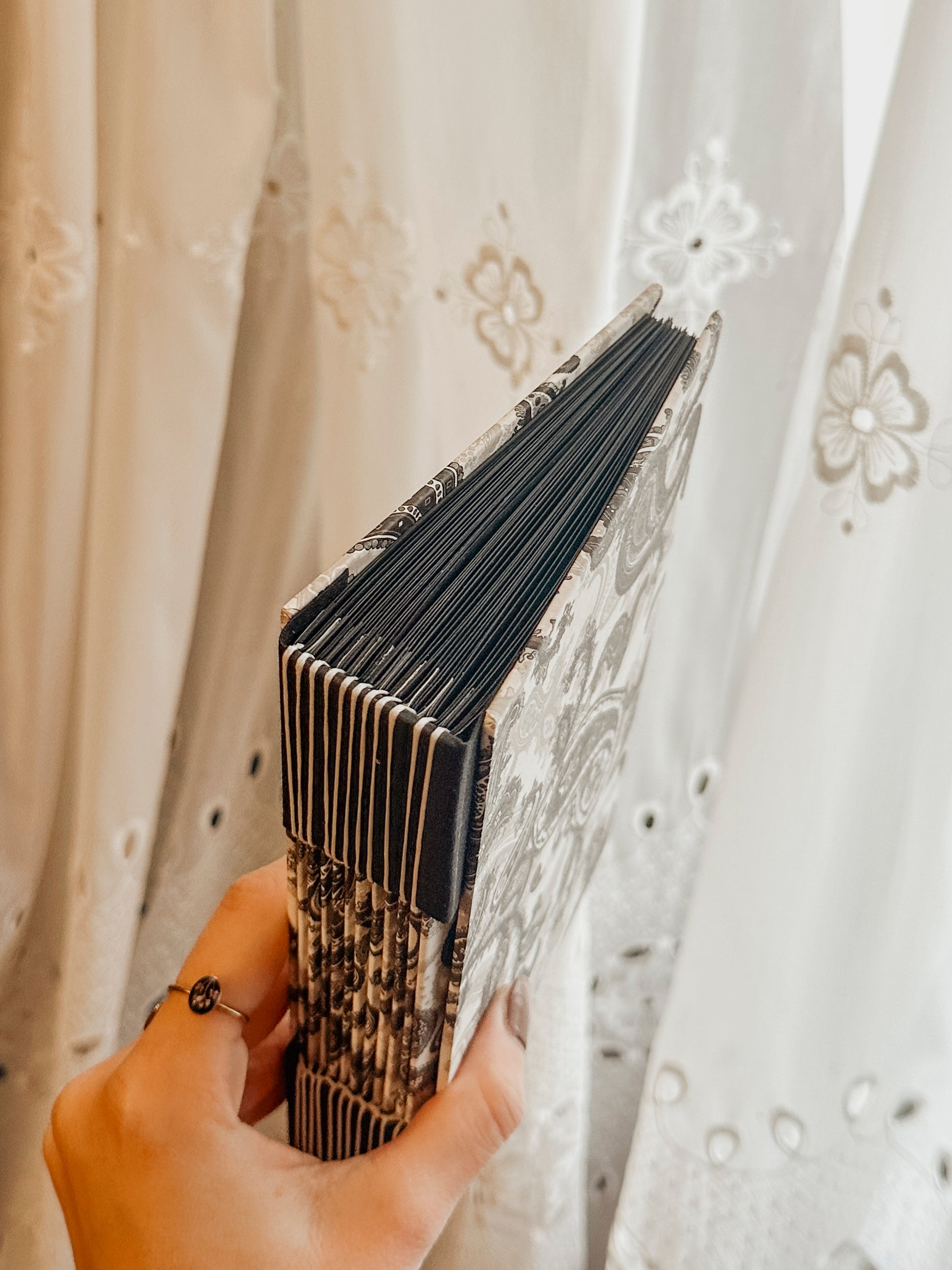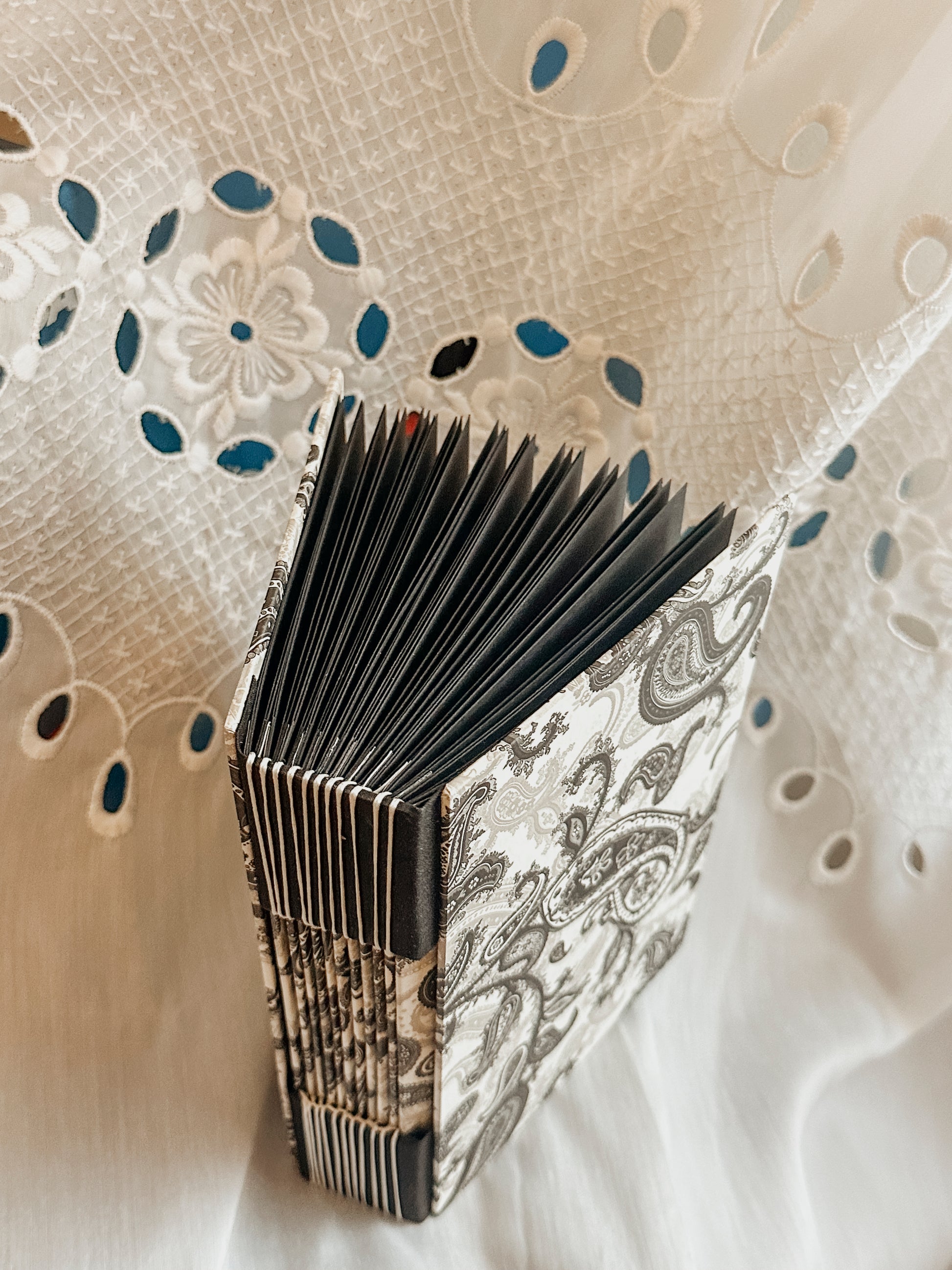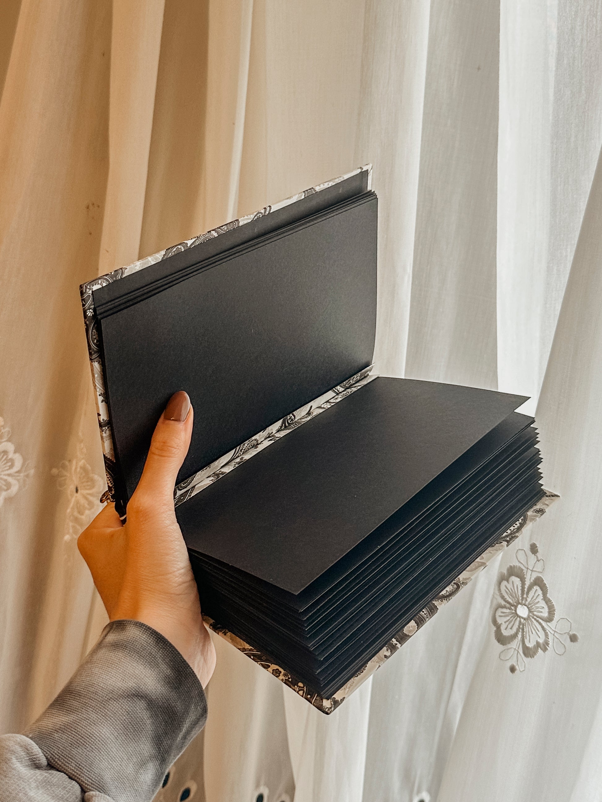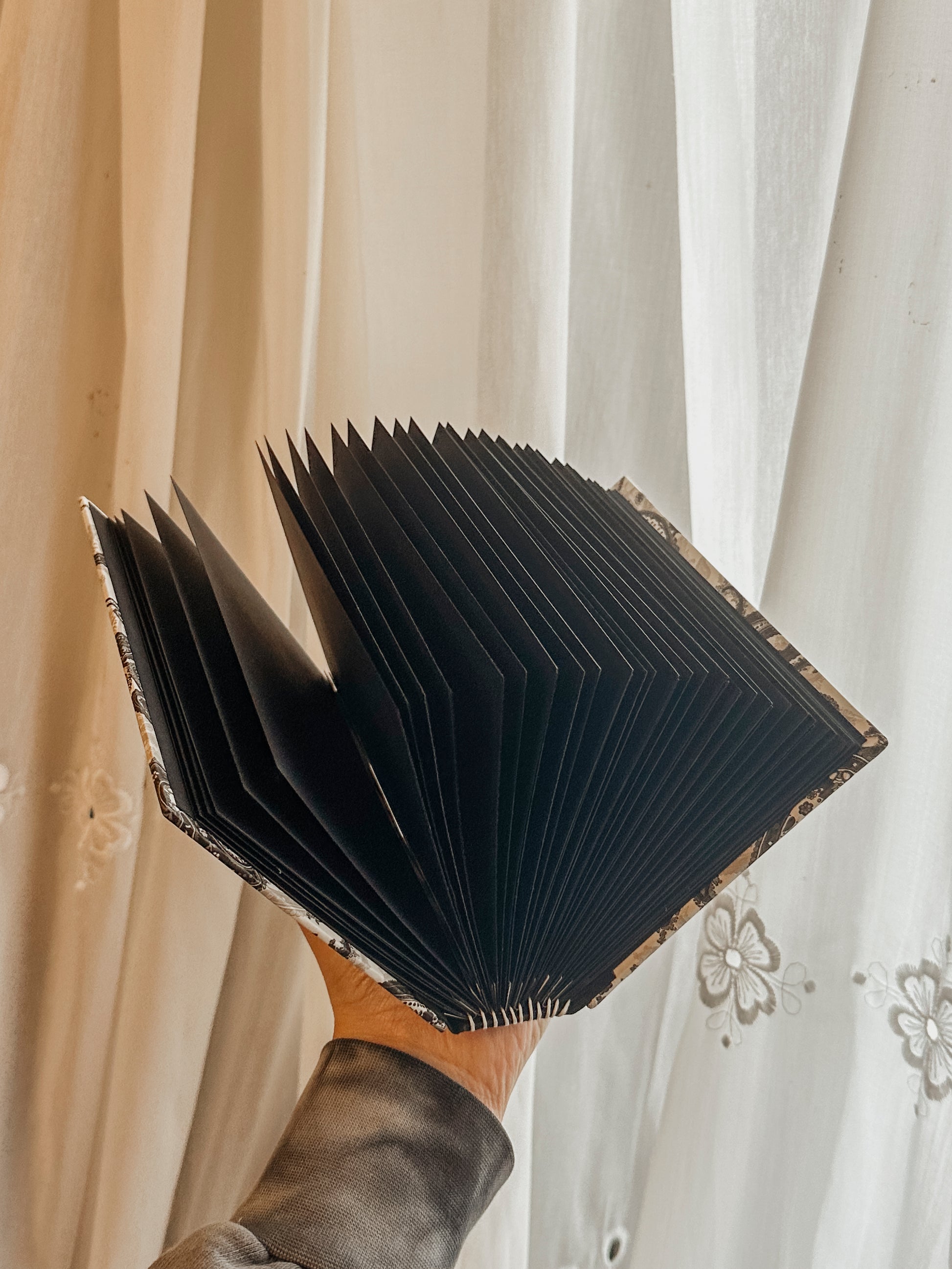Album con rilegatura buttonhole, pagine in cartoncino 220 g nere, copertina in carta decorata con motivo "presley" nera.