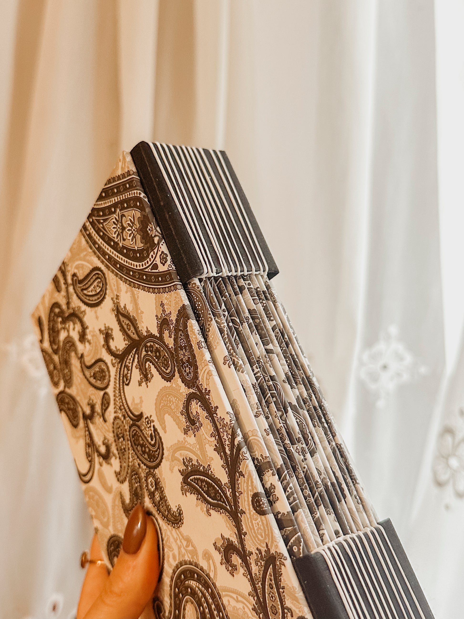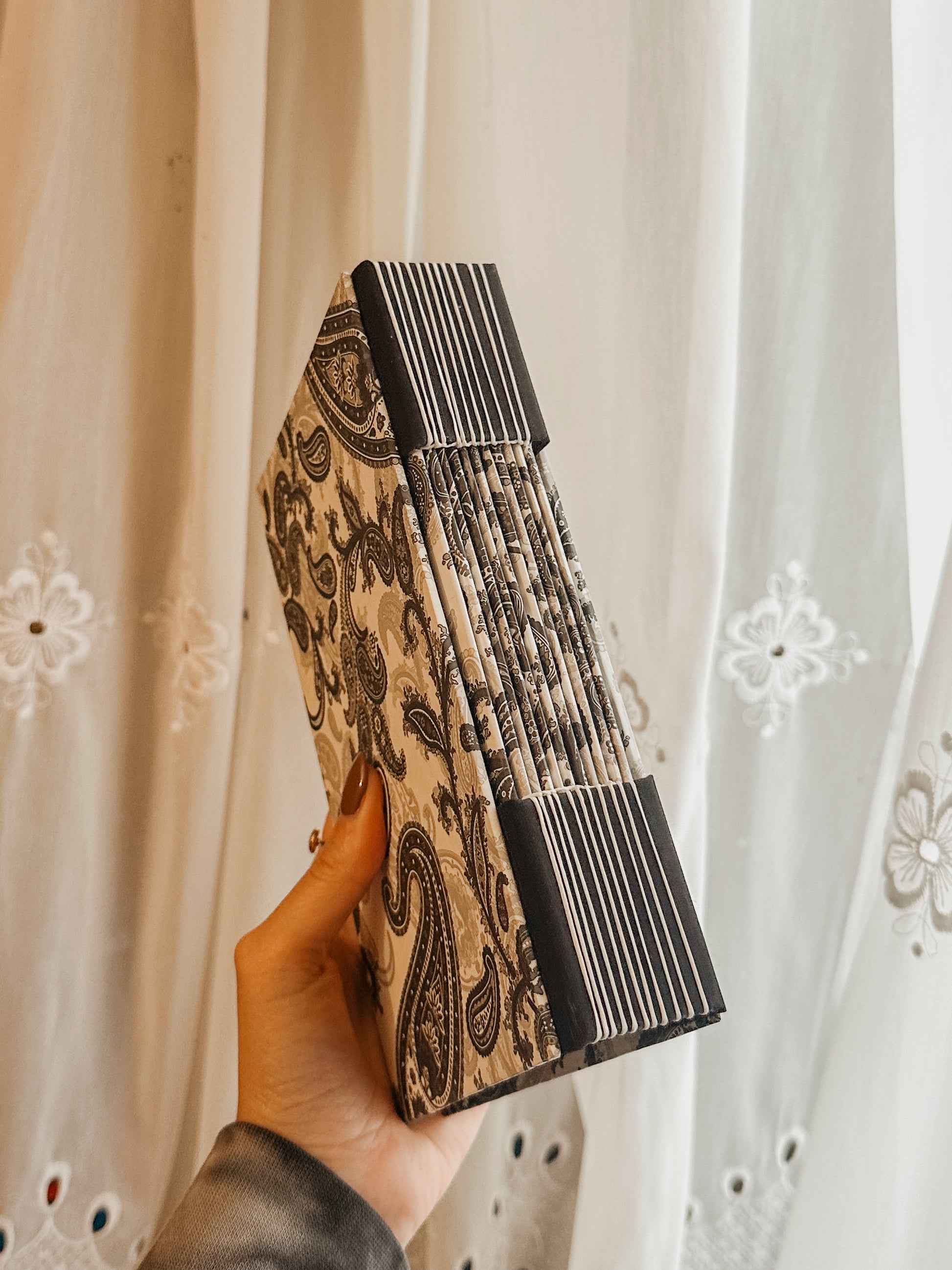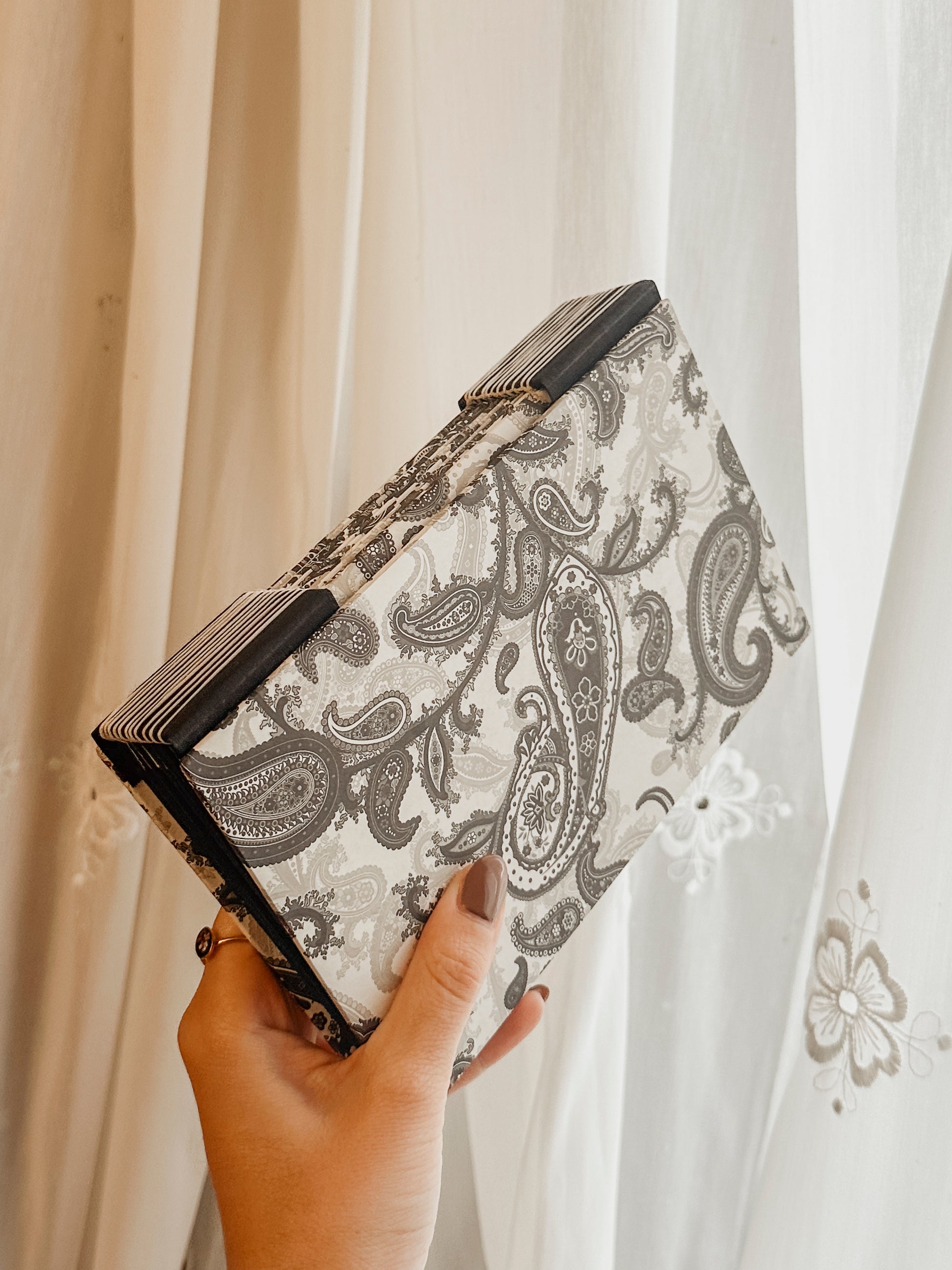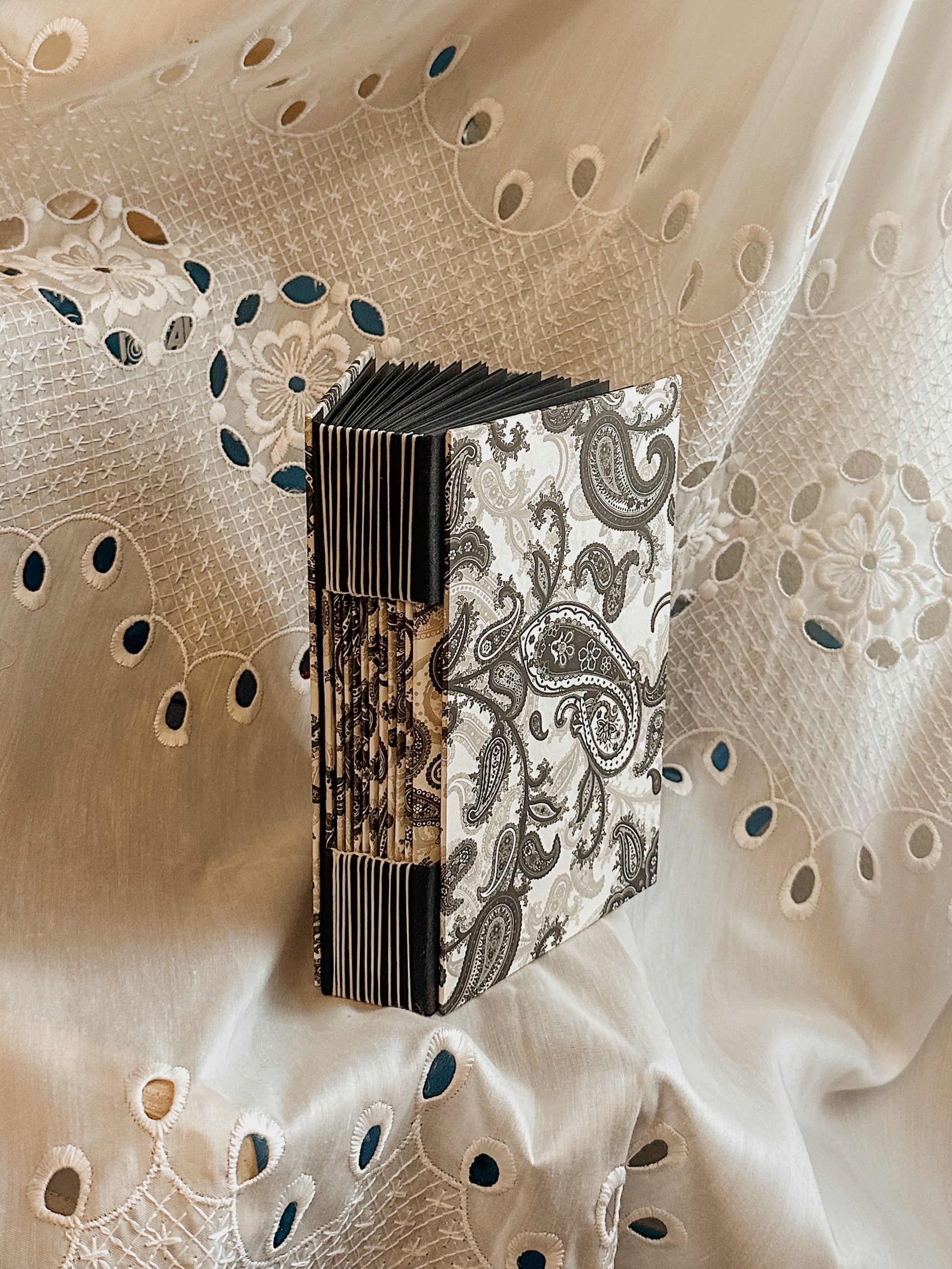 Album con rilegatura buttonhole, pagine in cartoncino 220 g nere, copertina in carta decorata con motivo "presley" nera.
