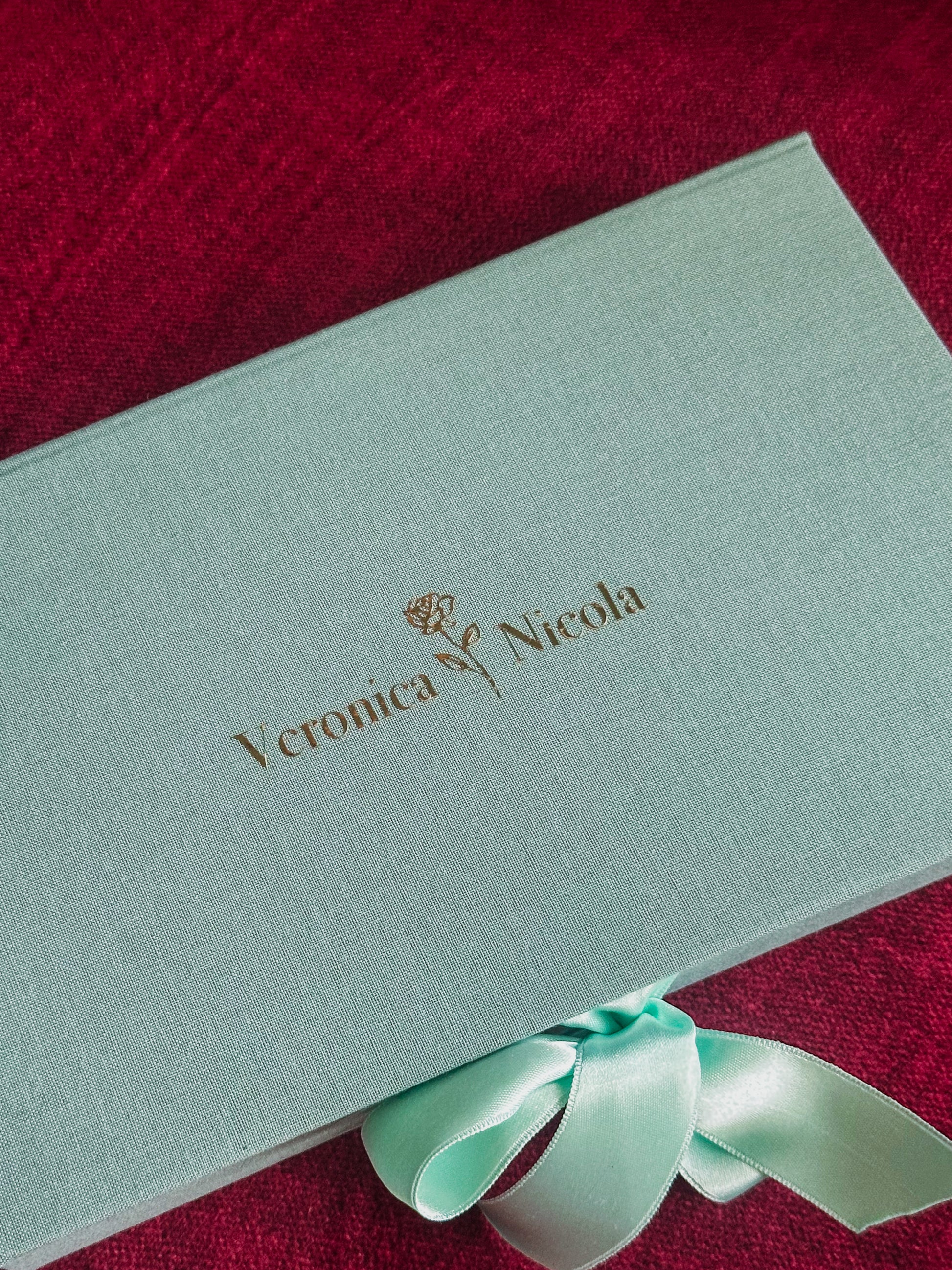 In stoffa verde salvia e nastri di raso per la chiusura. può ospitare fino a 70 foto 13x19.