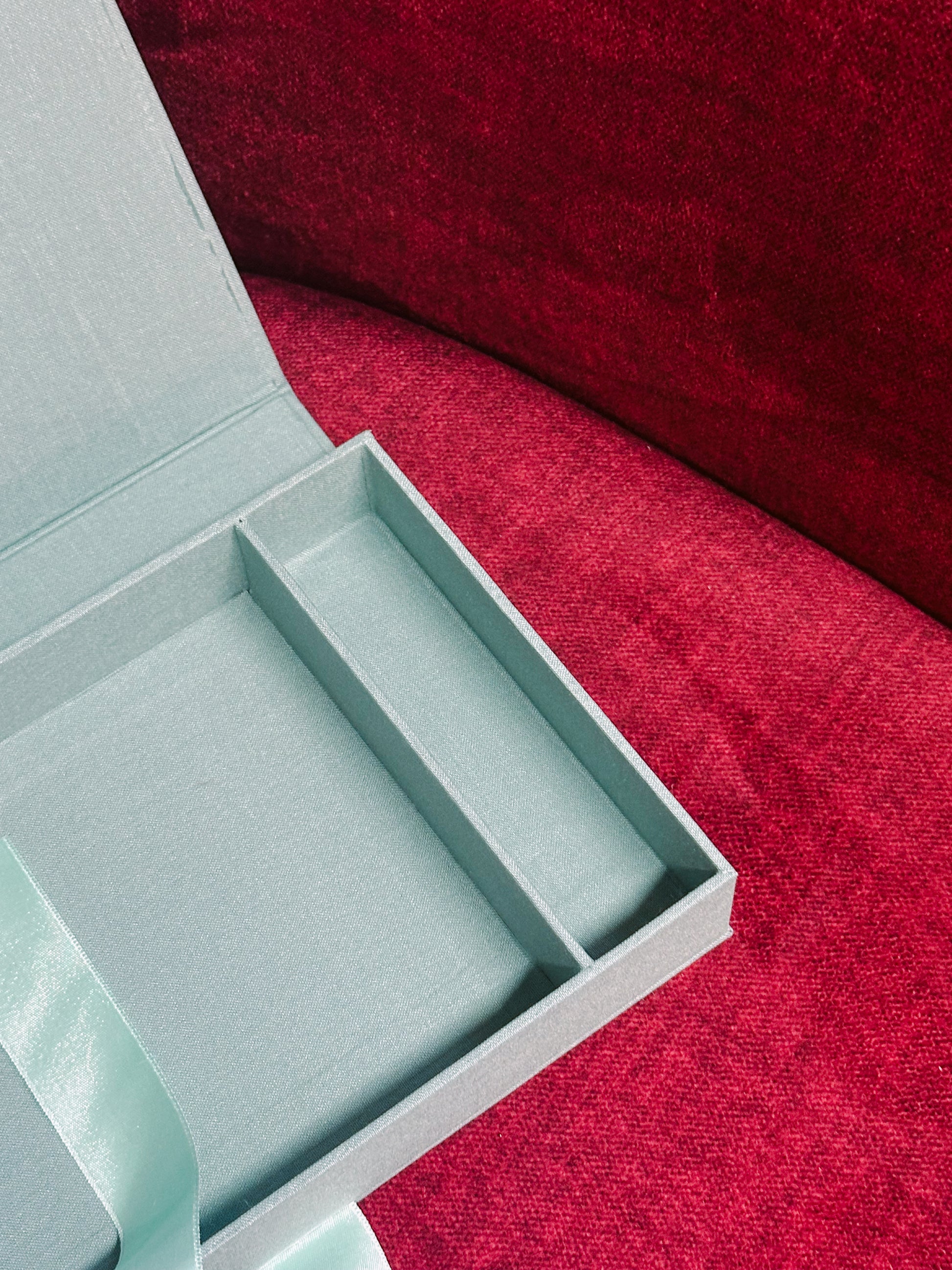 Cofanetto porta foto con scomparto USB, color salvia. PERSONALIZZABILE