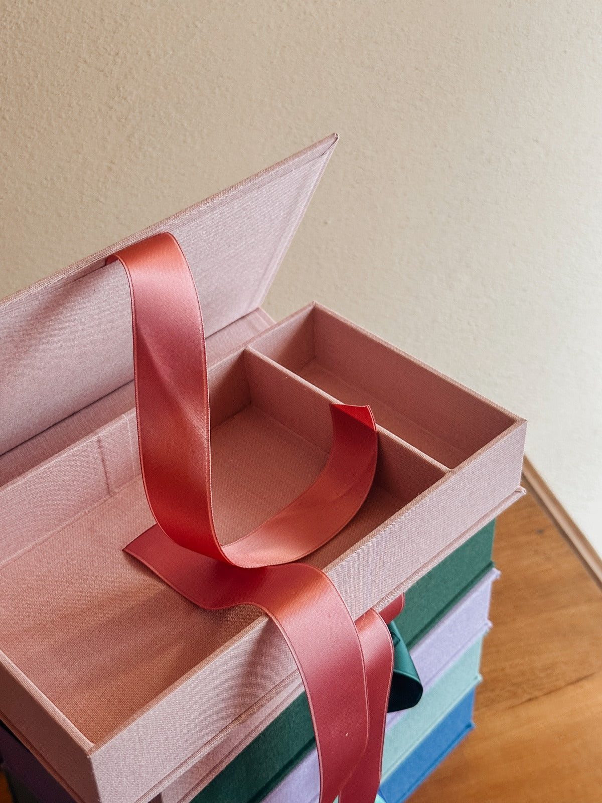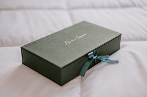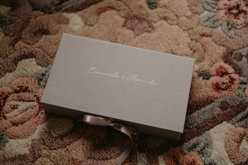 Box porta foto in stoffa, con incisione personalizzata fatta a mano.