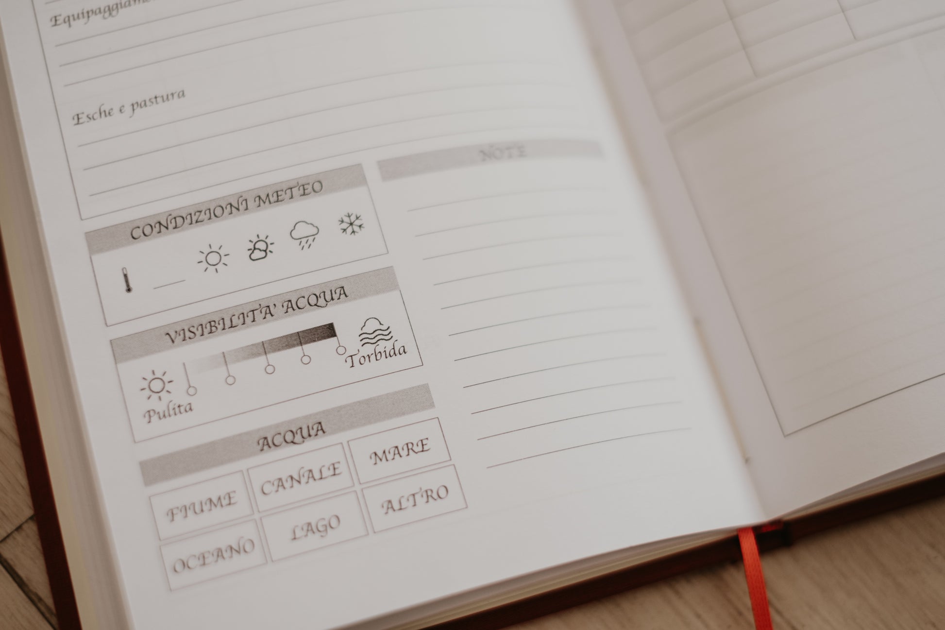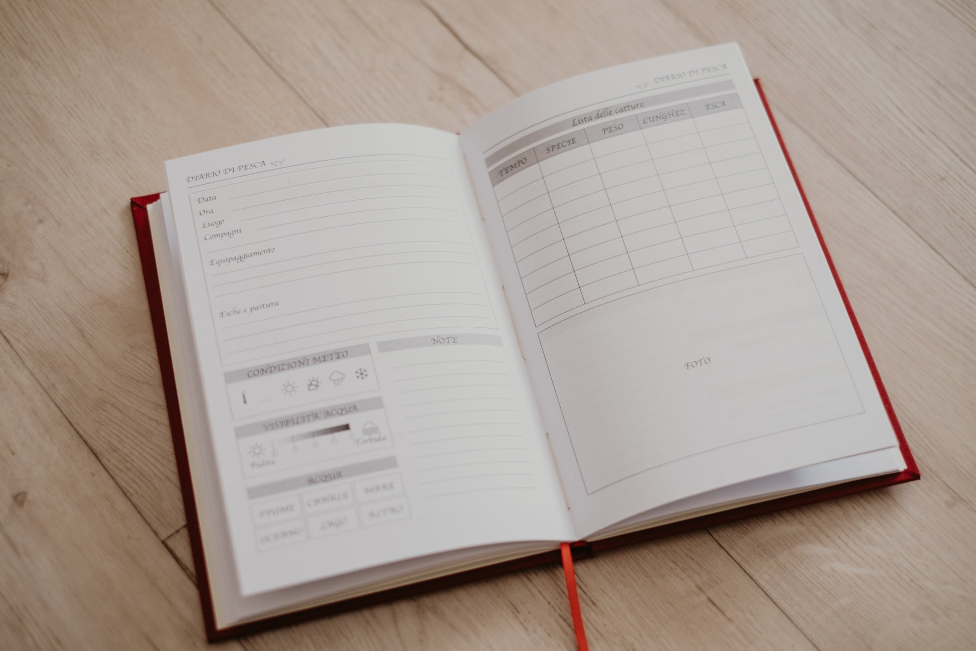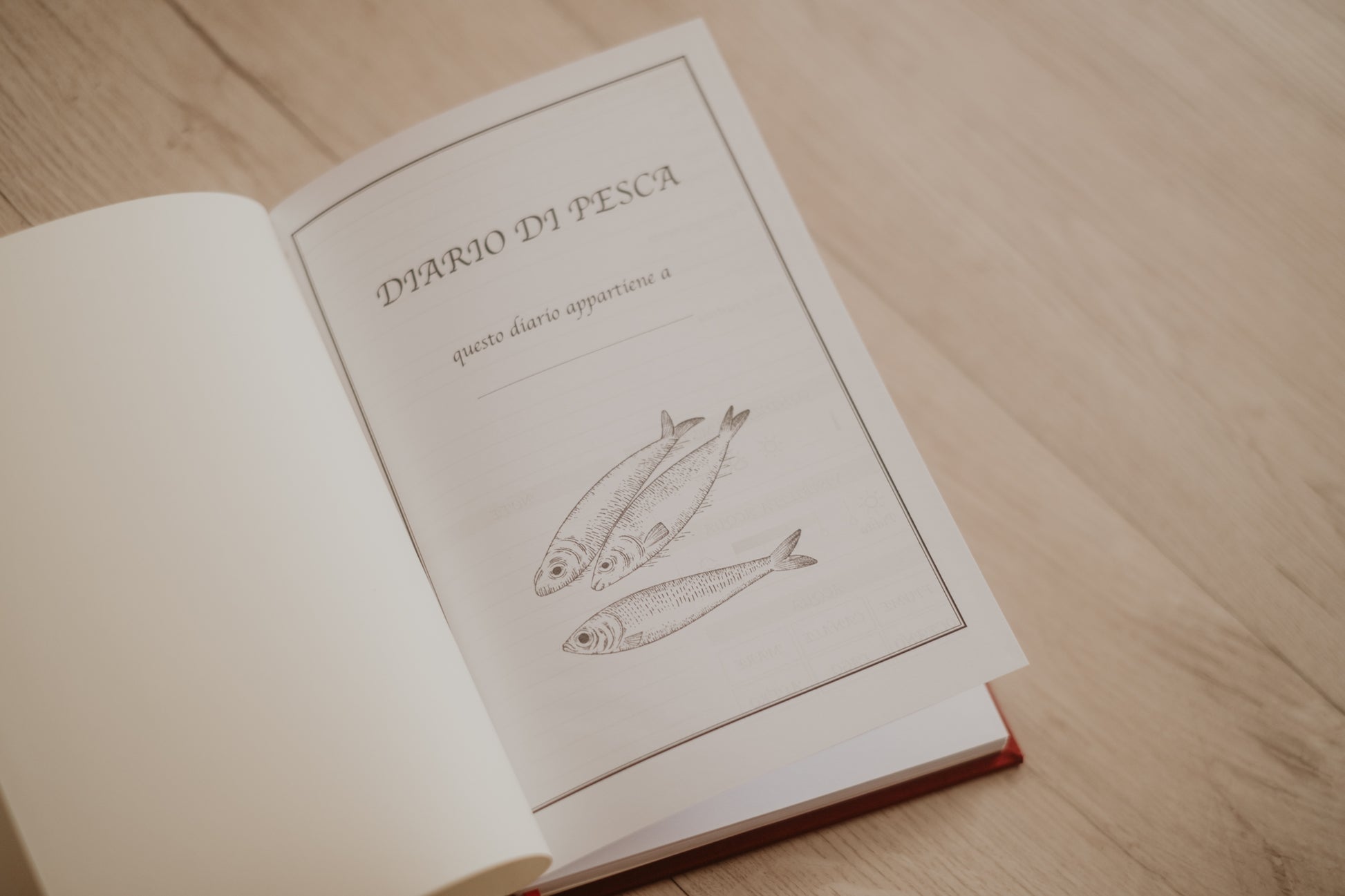 Diario di pesca personalizzato, copertina in stoffa e segnalibro.