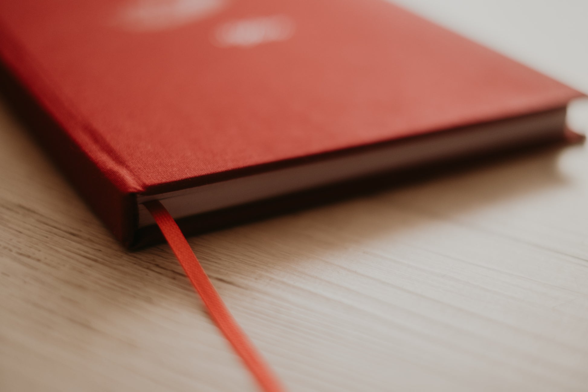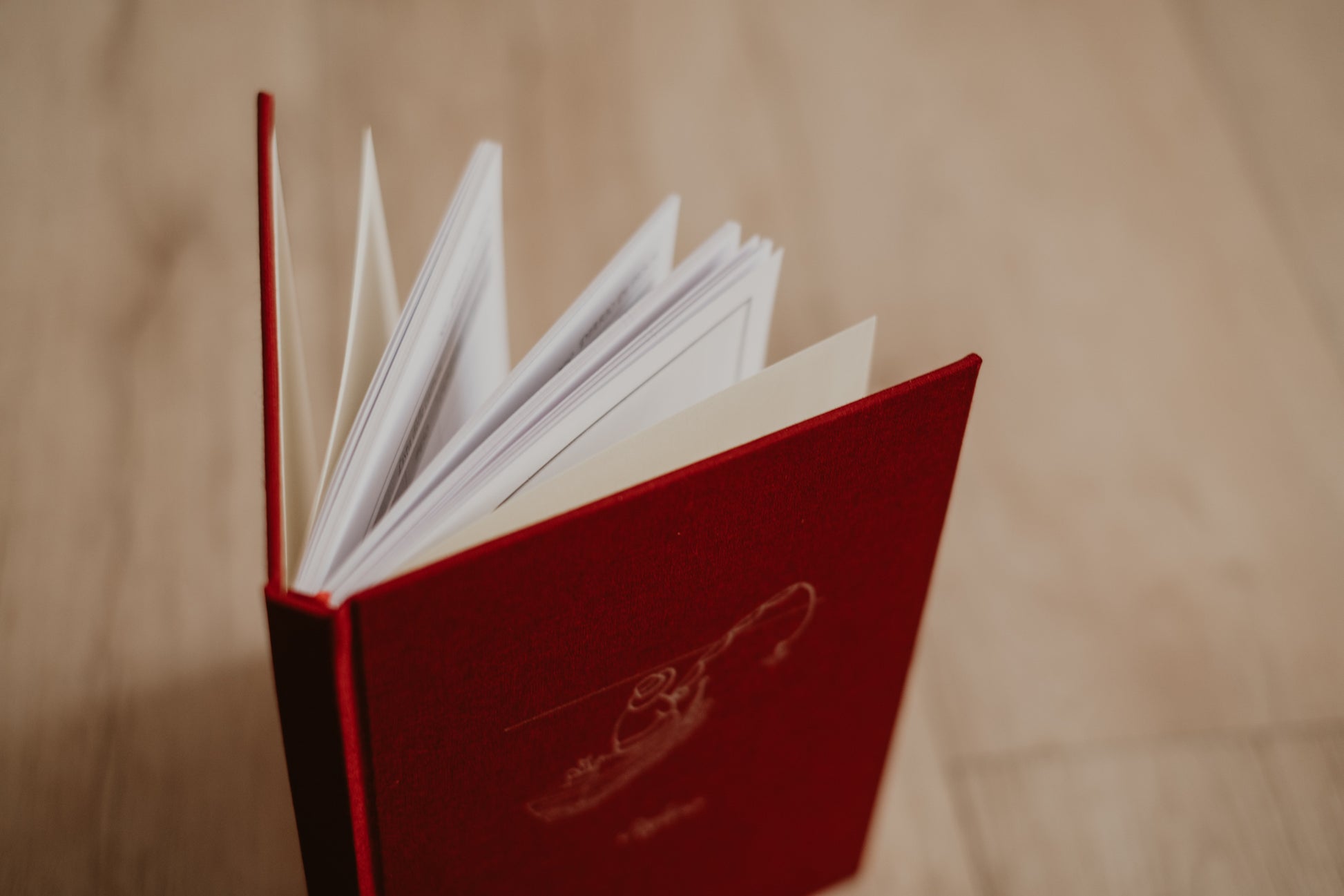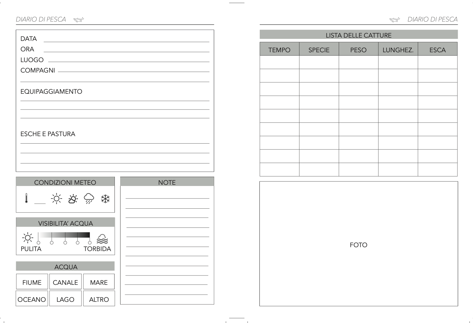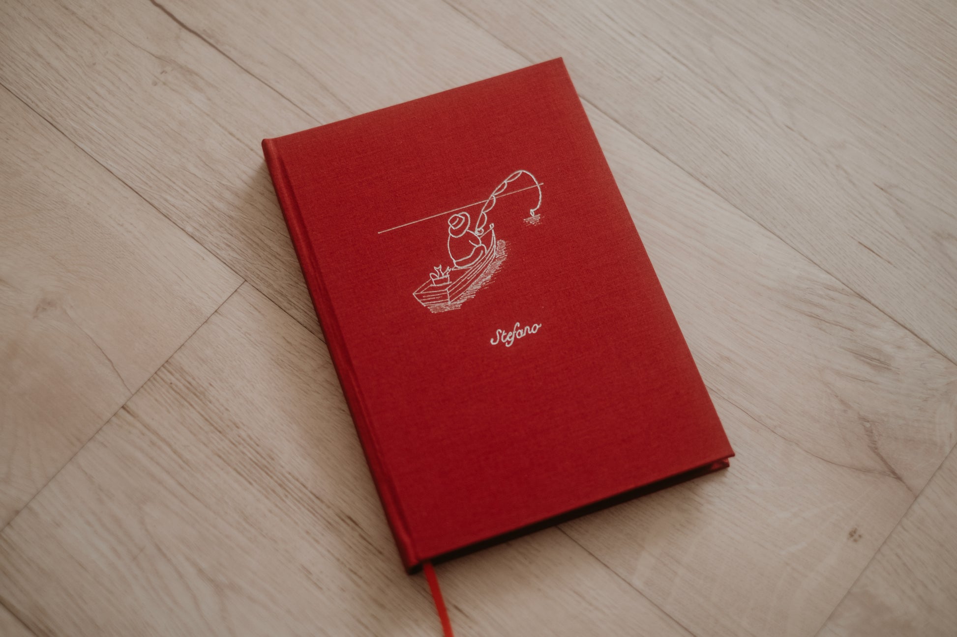 Diario di pesca personalizzato, copertina in stoffa e segnalibro.