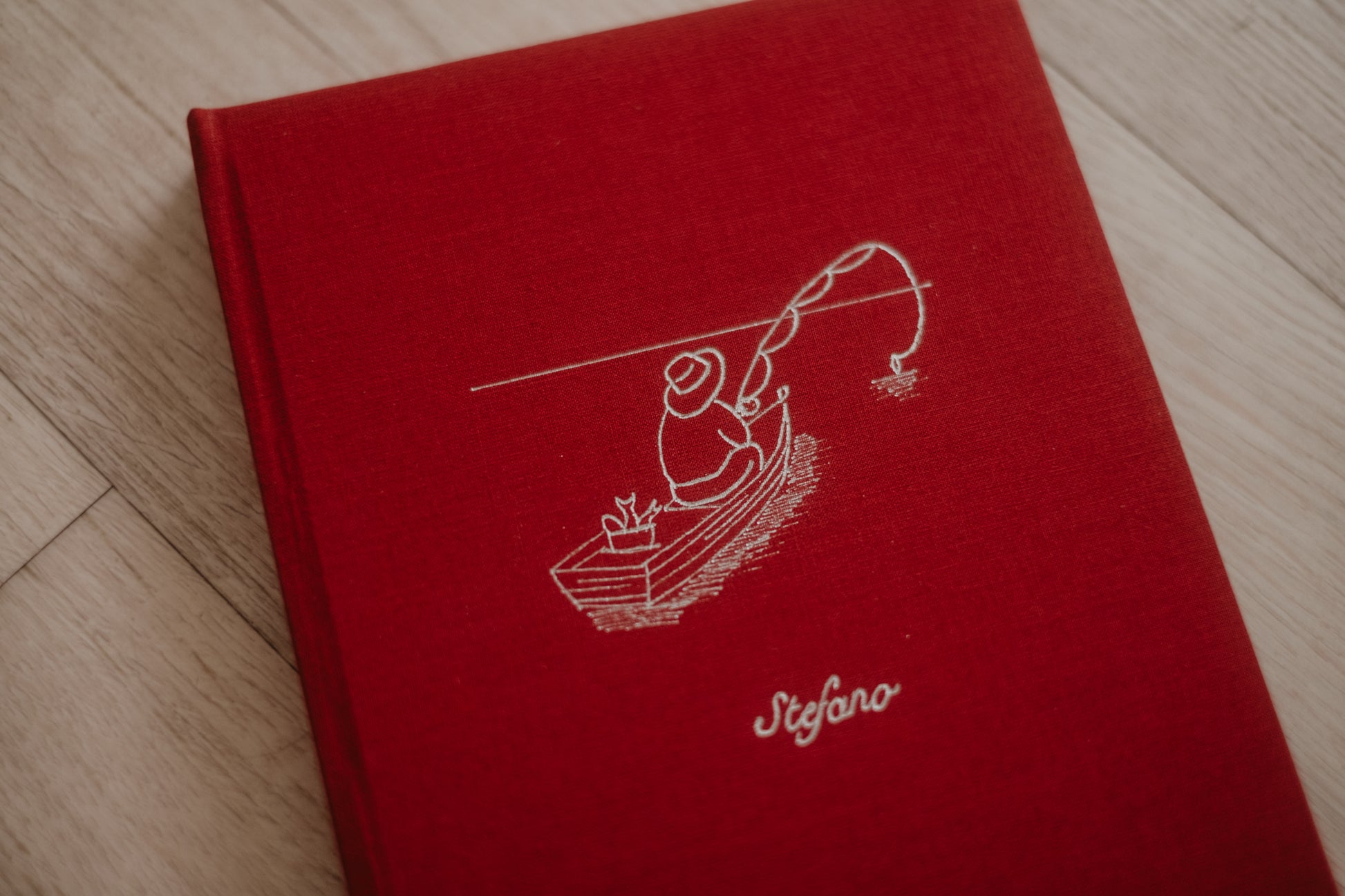 Incisione in copertina fatta a mano (oro o argento) con disegno di un omino che pesca + nome