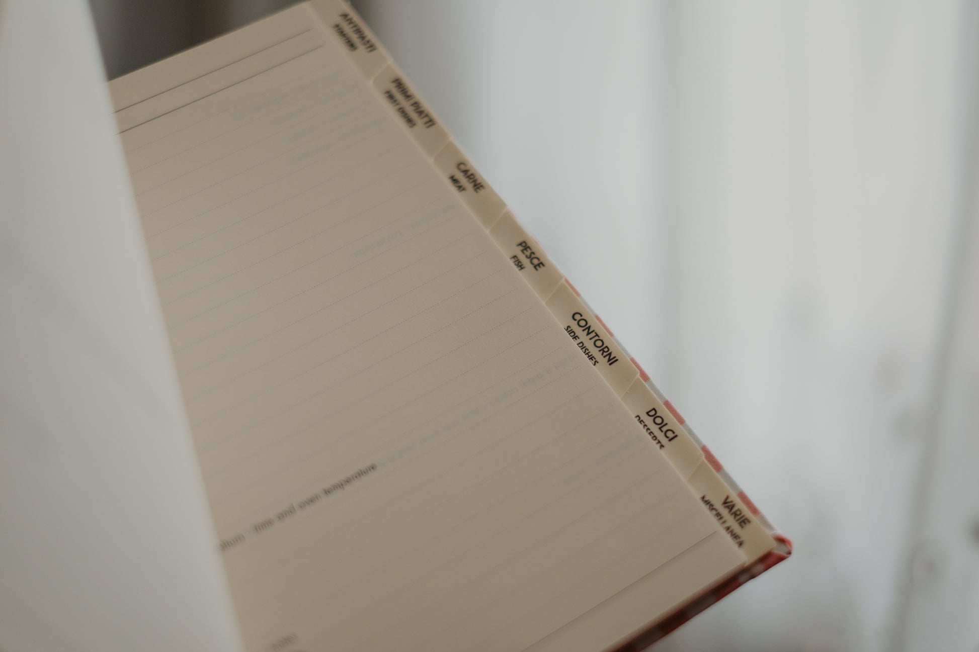 Ricettario misura A5, con pagine avorio precompilate dove poter scrivere le proprie ricette da custodire e ricordare .