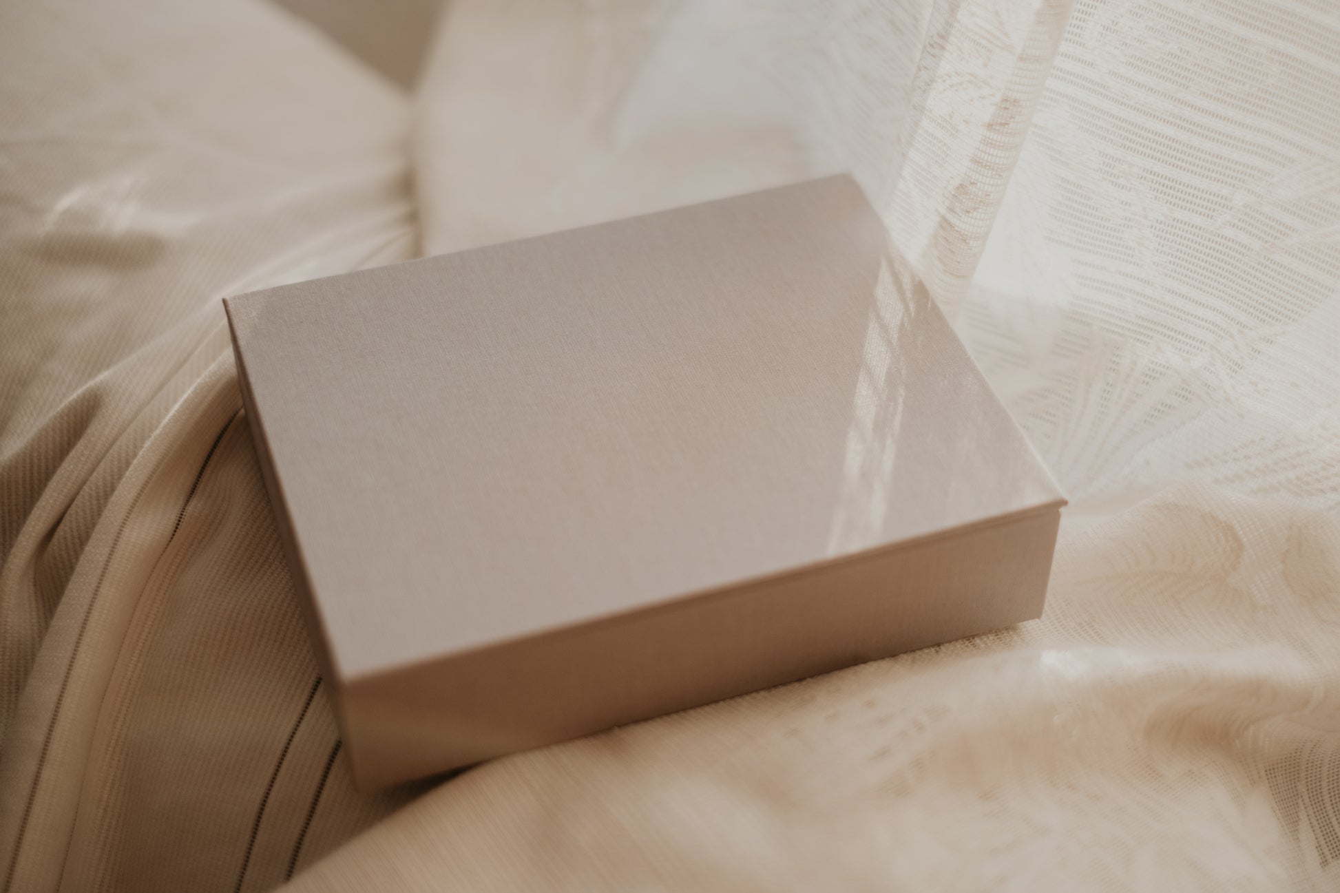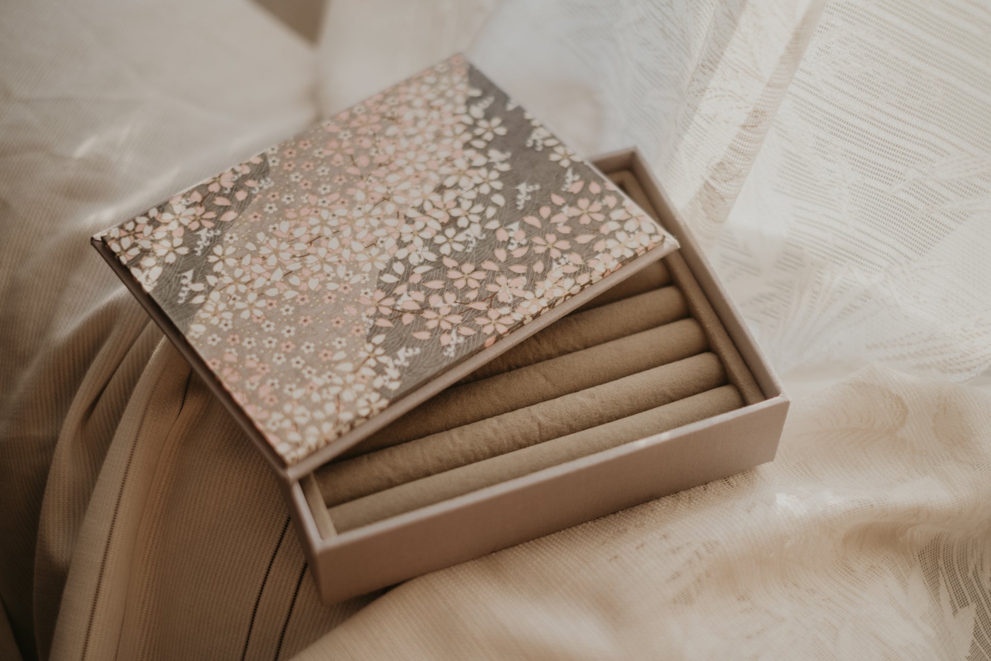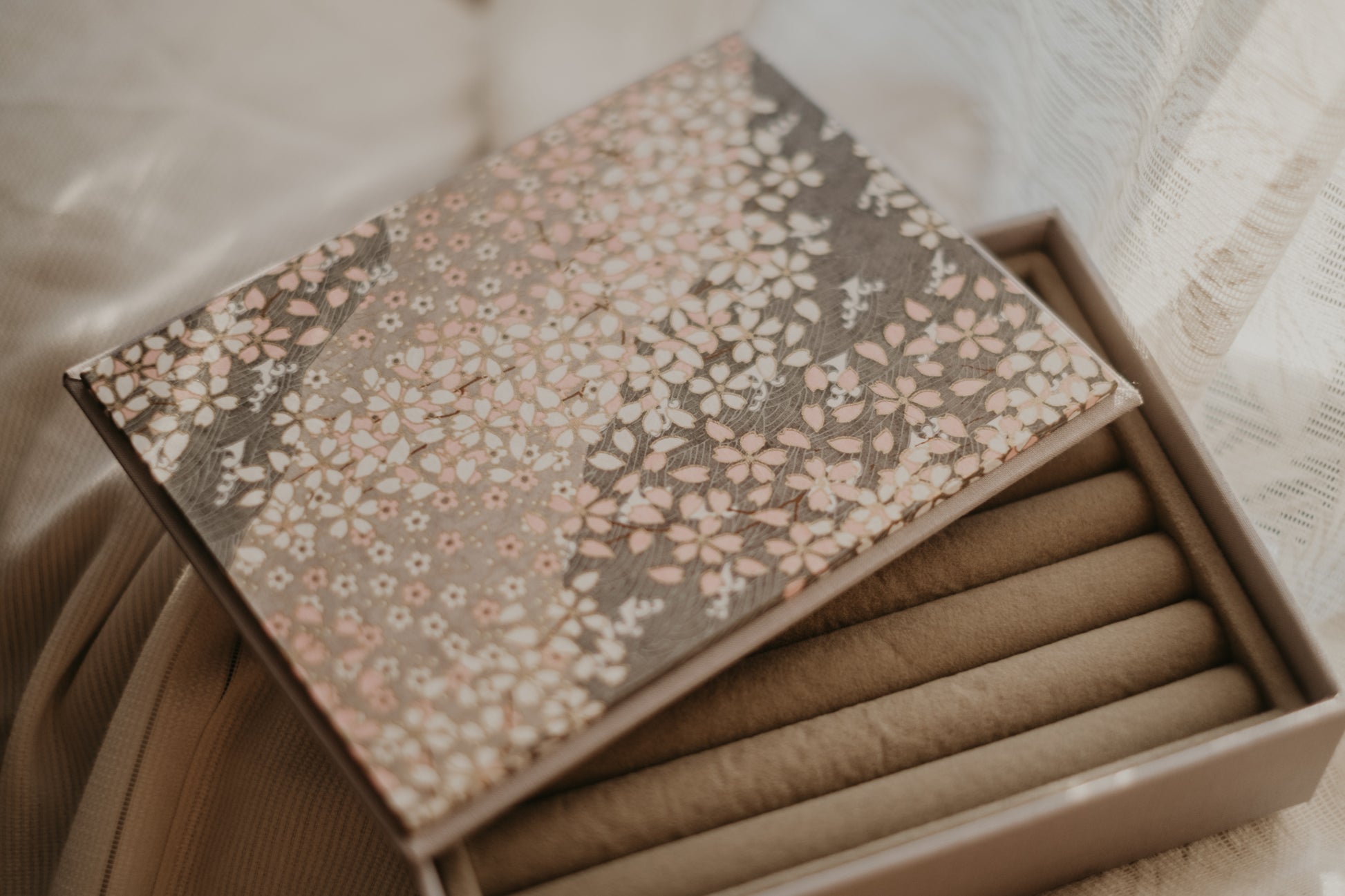 Stoffa grigia per l'esterno mentre l'incastro è ricoperto da una carta giapponese chiyogami decorata con fiori di ciliegio e dettagli dorati.