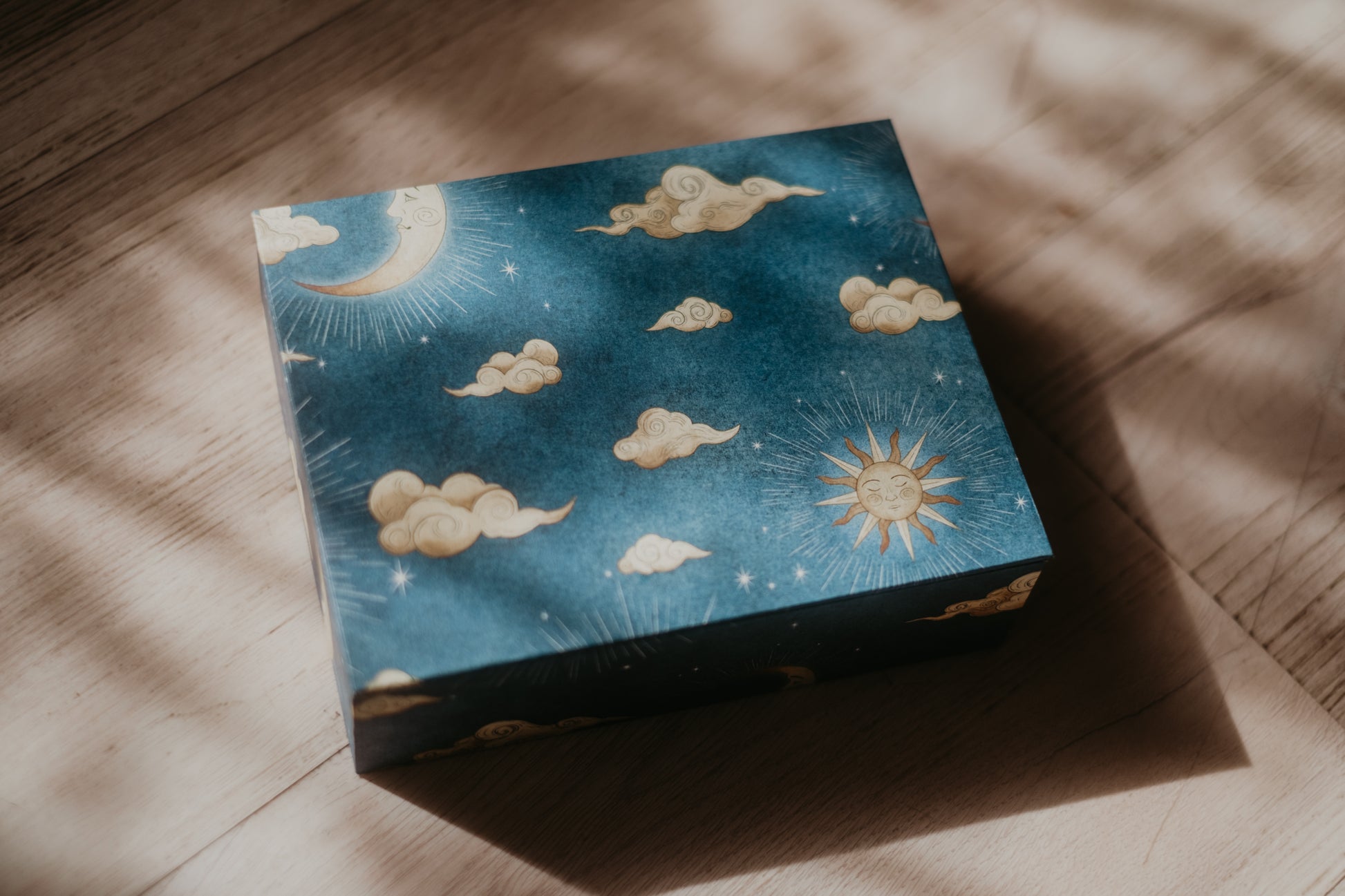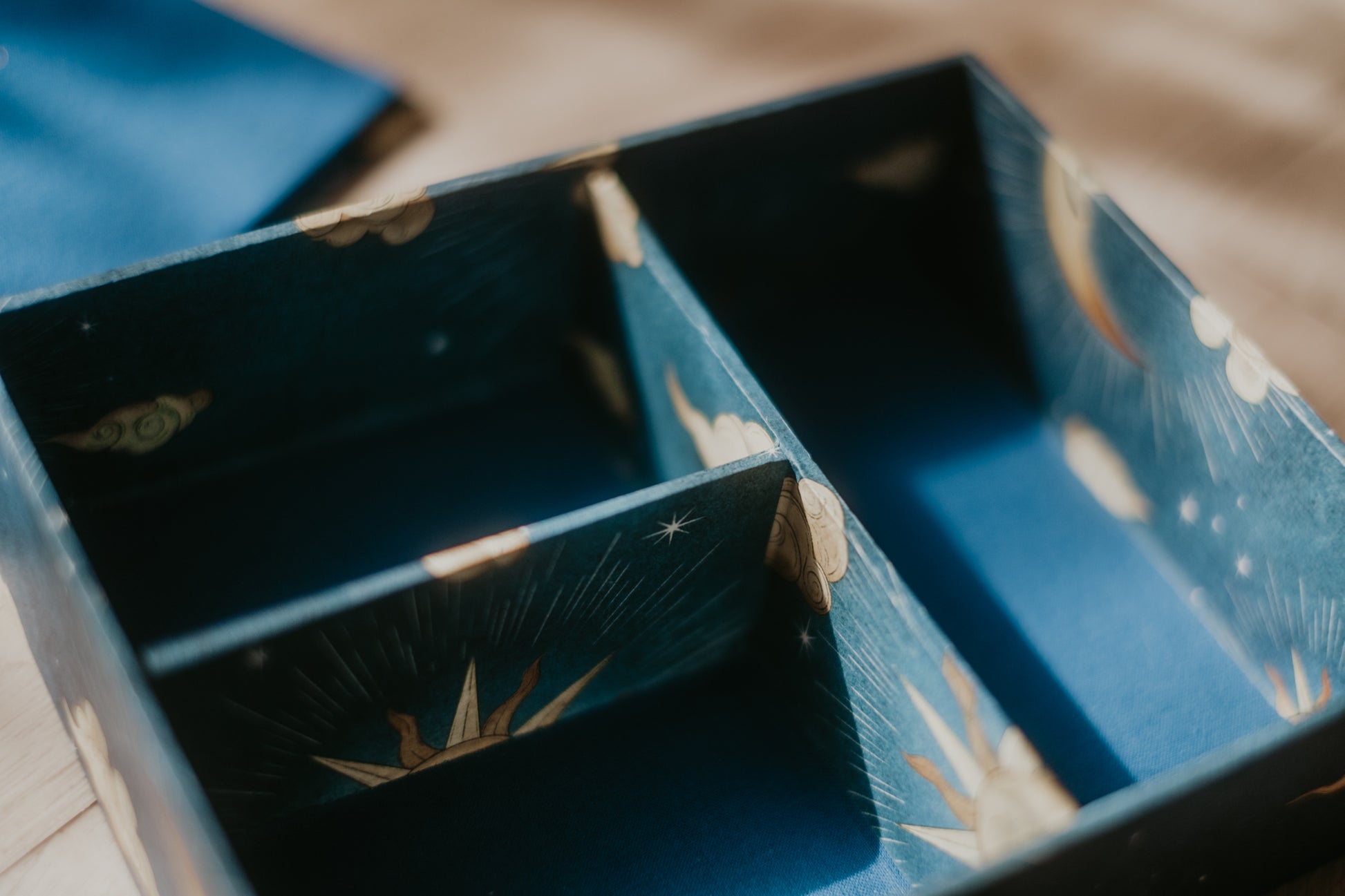Portagioie con 3 scomparti, decorato con la carta decorata di Tassotti "Sole e luna".