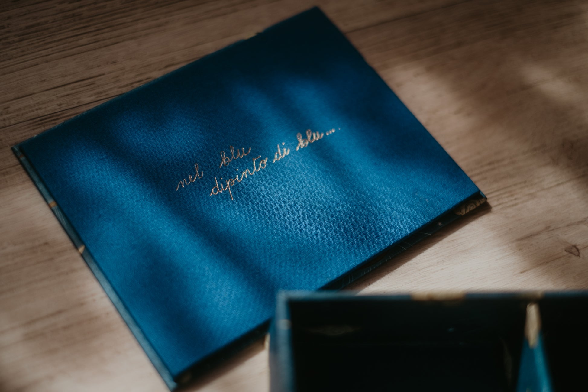 Il coperchio è a incastro, l'interno è in tessuto blu.