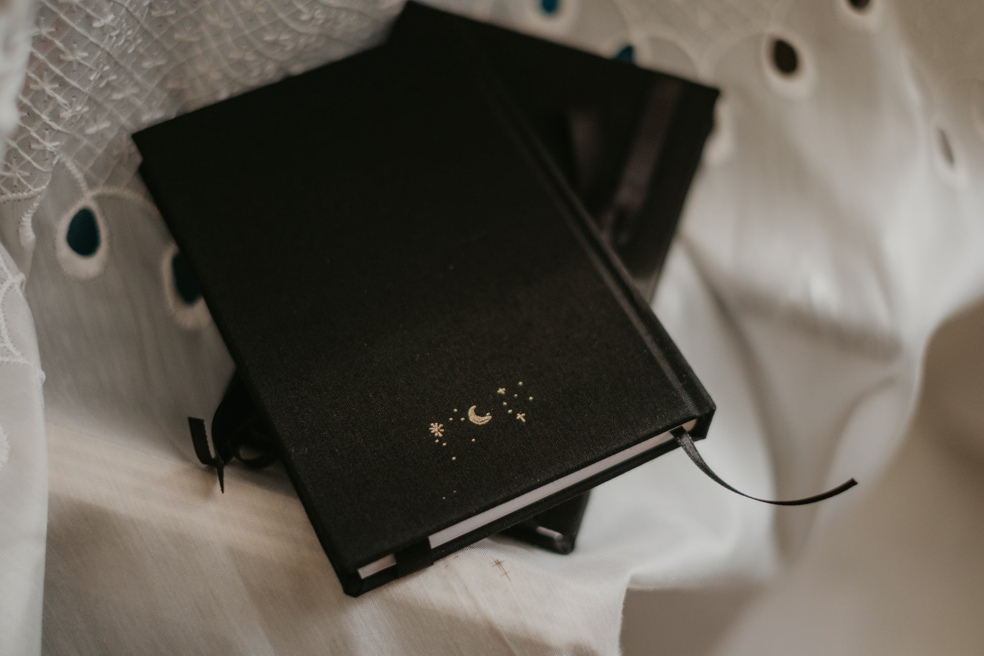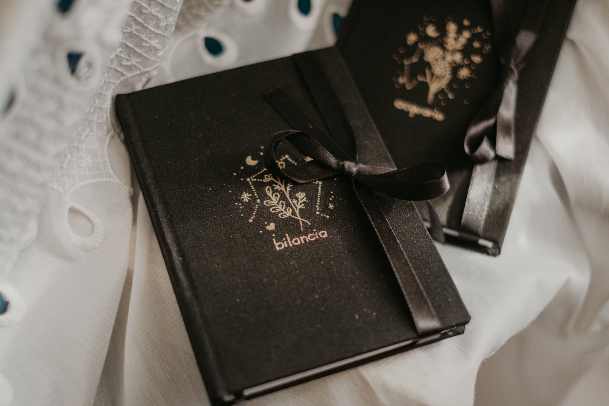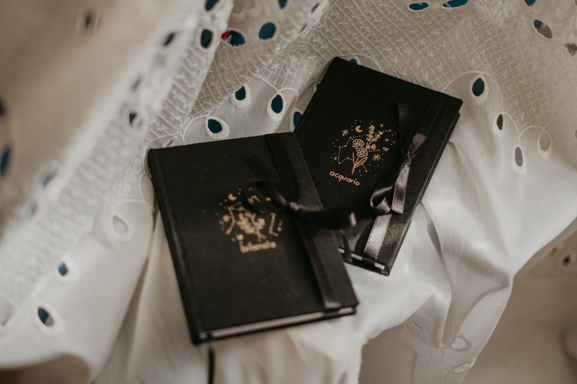 Quadernini A6 (10x15cm), in stoffa nera, con incisione del tuo segno zodiacale.